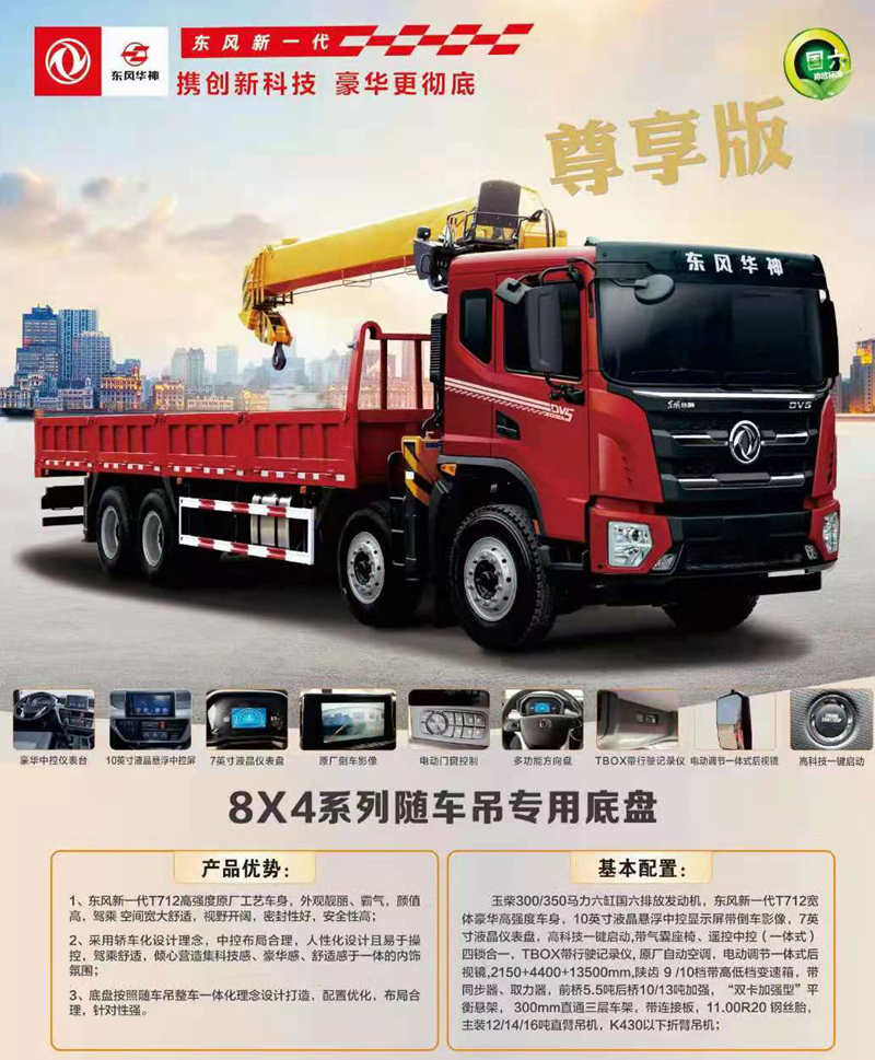 底盤配置:玉柴300/350馬力六缸國六排放發動機,東風新一代T712寬體豪華高強度車身,10英寸液晶懸浮中控顯示屏帶倒車影像,7英寸液晶儀表盤,高科技一鍵啟動,帶氣囊座椅、遙控中控(一體式)四鎖合一,TBOX帶行駛記錄儀, 原廠自動空調,電動調節一體式后視鏡,2150+4400+13500mm,陜齒 9 /10檔帶高低檔變速箱,帶同步器、取力器,前橋5.5噸后橋10/13噸加強,“雙卡加強型”平衡懸架, 300mm直通三層車架,帶連接板,11.00R20 鋼絲胎,主裝12/14/16噸直臂吊機,K430以下折臂吊機;